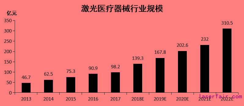 我國的激光醫療器械生產從上世紀90年代以來,年增長率高達20~30%,據中國產業信息網2017年的數據:激光醫療器械行業2017年市場規模98.2億人民幣,到2022年市場規模將達到310.5億元人民幣。據密爾醫療調研與分析,以上數據與全球宏觀數據還有所出入,幾個相對靠譜的數據是:2019年,全球激光醫療設備銷售額約70億美元,年復合增速約13%;其中激光皮膚治療應用占比接近50%,年復合增速約14%;中國市場銷售占比約15%,整體規模接近75億元,年復合增速超過18%;中國激光皮膚治療應用市場規模約30億元,全球占比不超過12%。