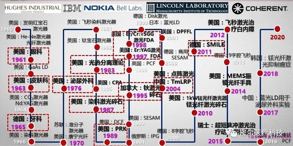 1960年5月,美國西奧多?梅曼發明世界第一臺激光器(紅寶石激光器,Cr3+:Al2O3, 694.3nm),在世界光學發展史上留下了濃墨重彩的一筆。激光技術在醫療中的緊密應用一直伴隨著激光技術的發展,激光器在1961年之前便開始被用于眼底疾病治療的動物實驗中,1963年用于皮膚疾病治療實驗,1965年用于牙科治療實驗,1976年用于泌尿外科疾病治療實驗……爾后經過嚴格證實、注冊后的激光醫療器械開始商業化。