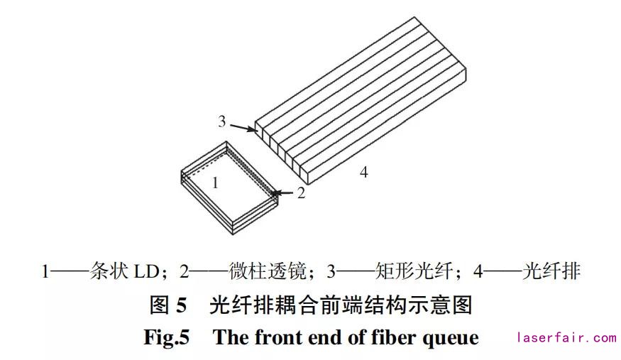 斜角光纖耦合技術和棱鏡耦合技術屬于同一種泵浦原理的耦合技術,但就工藝難度相比而言,斜角光纖耦合技術最容易實現。根據有關理論分析,斜角光纖的耦合效率與端面斜角有關,最大耦合效率時存在唯一一個最佳角度,該最大耦合效率值與光纖參數有關。另外,斜角光纖耦合技術對于非尾纖輸出的條狀半導體激光器泵浦光的耦合特別有效,將數根矩形光纖或玻璃絲排列成光纖排,前端面與條狀 LD 輸出面通過微柱透鏡耦合(見圖 5),后端的光纖或玻璃絲各自獨立, 每根末端均磨成斜角,分別在雙包層光纖內包層側面的不同位置耦合,適用于多點泵浦。