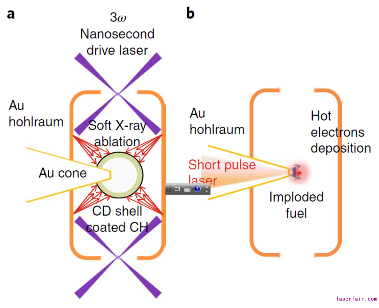 圖1. 間接驅(qū)動(dòng)快點(diǎn)火方案示意圖。將慣性約束聚變過(guò)程分為了兩個(gè)過(guò)程:(a)內(nèi)爆預(yù)壓縮和(b)快速等容點(diǎn)火
