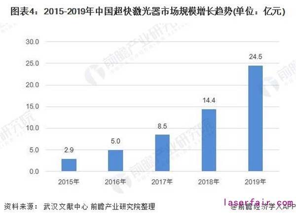 根據武漢文獻中心發布的《2020中國激光產業發展報告》,2019年我國超快激光器市場規模達24.5億元,2015-2019GAGR超過70%,遠高于激光器行業平均增幅。