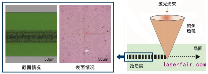激光隱形切割作為激光切割晶圓的一種方案,很好的避免了砂輪劃片存在的問題。如圖1所示,激光隱形切割是通過將脈沖激光的單個脈沖通過光學整形,讓其透過材料表面在材料內部聚焦,在焦點區域能量密度較高,形成多光子吸收非線性吸收效應,使得材料改性形成裂紋。每一個激光脈沖等距作用,形成等距的損傷即可在材料內部形成一個改質層。在改質層位置材料的分子鍵被破壞,材料的連接變的脆弱而易于分開。切割完成后通過拉伸承載膜的方式,將產品充分分開,并使得芯片與芯片之間產生間隙。這樣的加工方式避免了機械的直接接觸和純水的沖洗造成的破壞。目前激光隱形切割技術可應用于藍寶石/玻璃/硅以及多種化合物半導體晶圓。