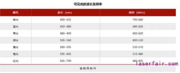 圖中水平的兩條橫線E2和E1表示電子的能級,越高表示電子的能量越高(VIP 等級越高),左邊自發(fā)輻射電子從高能級向低能級躍遷,同時輻射出一個能量等于兩能級能量差的光子;而受激輻射則是在外加光子的作用下,輻射出一個完全一樣的光子,這就是所謂“受激”的過程。這里再補充一下, hν在是一個光子的能量,其中h是普朗克常數,可以不用管它,而ν則是光的頻率,它直接決定了我們看到的光的顏色,每一個頻率都對應著一個確定的顏色,下表列舉了可見光所對應的頻率和波長范圍(波長和頻率也是一一對應的)。我們可以看到,紅橙黃綠青藍紫,光的頻率是逐漸增高的,這也就是為什么我們生活中看到溫度越高的光源,其顏色越偏向藍色。
