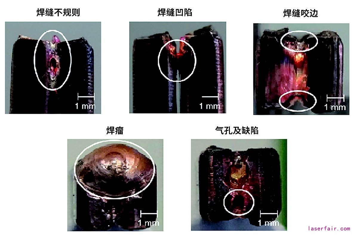 激光在焊接Hairpin接頭時,容易出現如圖6中的五種缺陷[8],分別是:焊縫不規則,焊縫凹陷,焊縫咬邊,焊瘤,氣孔及缺陷。這五種缺陷屬于第三步沒有控制好的缺陷,可以通過改善焊接的功率、速度、振蕩頻率來改善工藝參數匹配,能夠得到良好的焊接結果。如果當前的激光頭不能焊接出較好的焊縫,則可以通過選擇光束質量更好的激光器,或者傳輸光束質量更穩定的激光頭來進行焊接,例如,有時激光頭冷卻不穩定也容易影響焊接質量。