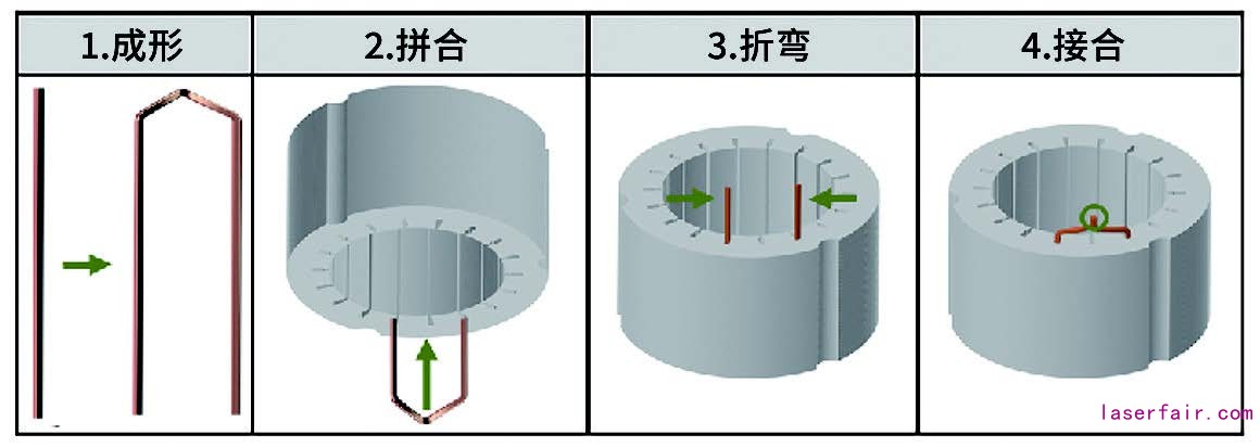 目前,Hairpin電機的生產工藝只能采用全自動的生產流程,因為其對生產穩定性及合格率有極高的要求,所以半自動及人工生產是不太現實的。如表1所示,Hairpin電機的生產主要分為四個步驟:第一步,是將銅條折彎成“U”型。整個“U”型區域折彎角度對Hairpin電機的電導率是有極大影響的,因為被折彎區域的微觀原子結構會受到擠壓,導致電導率的變化[5]。這個折彎過程現有兩種主要工藝——使用沖壓模具折彎成需要的角度;另外一種方法是使用專用折彎機,分四個步驟折彎成需要的形狀。這兩種方法需要保證折彎的銅條角度一致無回彈,而且兩個端子的距離要保持一致。第二步,是將折彎好的銅條放置在插槽當中,這種放置也是需要按一定規則擺放,使得銅條有序且緊密布置在插槽中。第三步,端口折彎,需要將露出的端子折彎,使得端子之間能夠緊密連接,給下一步焊接工序做好準備。目前這種端子折彎一般使用3DCNC機床進行折彎,折彎角度需要一致以便連接到另外一個“U”型Hairpin。如圖2所示,在折彎之后,端子需要緊密連接在一起,因為焊接過程不容許太多間隙且角度需要一致,這樣才能保證焊接前的工序一致性。