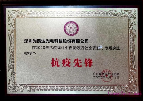 在首先舉行的廣東省激光行業協會第二屆第三次會員大會上,光韻達被授予“抗疫先鋒”及“熱心公益、扶貧助學”兩項榮譽稱號,以表彰企業在抗擊新冠肺炎疫情期間捐款捐物的義舉,以及作為廣東省激光行業協會會長單位積極響應協會扶貧助學等公益活動的善舉。