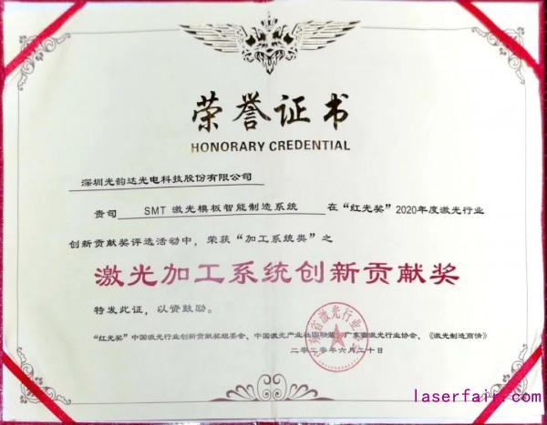 當晚,激光行業大獎“紅光獎”頒獎盛典揭曉了5大類別12大獎項的得主,覆蓋尖端科技類、企業類、激光器類、加工系統類、配套設備類等類別,共有33家企業榮獲獎項,一批被市場認可的創新產品、一批為激光行業的創新做出突出貢獻的企業脫穎而出。其中,光韻達參選的“SMT激光模板智能制造系統”榮獲“加工系統類”““激光加工系統創新貢獻獎””。