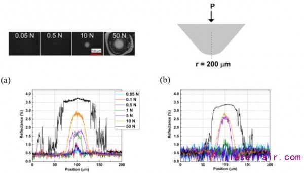 圖3 納米結構靜態魯棒性實驗結果:使用半徑為200μm的標準尖端加載(a)351nm結構和(b)1053nm結構,負載范圍為50 mN至50 N。