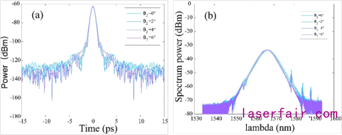課題組提出了一種提高鎖模光纖激光器SNR的新方法。通過改變激光諧振腔中保偏光纖之間的連接角度產生Lyot濾波效應,針對性地抑制了光纖鎖模激光器中強非線性相移在鎖模光譜上產生的Kelly邊帶,提高了鎖模光纖激光器的信噪比。與其它光譜濾波方法相比,Lyot濾波方案具有插入損耗小,結構簡單,調制深度和透射峰波長可調等優點,在不影響鎖模孤子形狀的前提下,能更有效地對Kelly邊帶進行抑制。實驗表明,當光纖連接角從0°增加到6°時,輸出脈沖的信噪比增加8dB。具有高信噪比性能的光纖鎖模激光器,有望在未來的高功率激光系統中取代固體激光器作為新一代種子光源。(高功率激光物理聯合實驗室供稿)