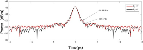 在高功率拍瓦激光系統中,種子激光脈沖的SNR是至關重要的參數,前端輸入脈沖的信噪比直接影響了整個系統的信噪比。目前應用于神光II拍瓦前端的是商用飛秒固體鎖模激光器,其信噪比約為90dB,無法采用光纖鎖模激光器的原因之一在于其信噪比無法與固體鎖模激光器相比。光纖鎖模激光器在固體介質中傳播距離更長,在較高的峰值功率密度條件下,自相位調制(SPM)引起的非線性相移會嚴重影響脈沖的頻譜和時域特性。當累積的非線性相移無法控制或補償時,導致的脈沖分裂會極大地影響脈沖的SNR。