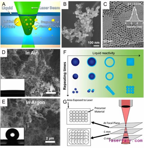 (F)激光輻照條件下納米粒子形貌隨溶液反應性及脈沖次數的變化規律。