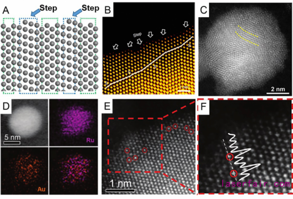 (D-F) 負載Au單原子的Ru納米顆粒元素分布圖像及其AC-HAADF-STEM圖像(E和F)。