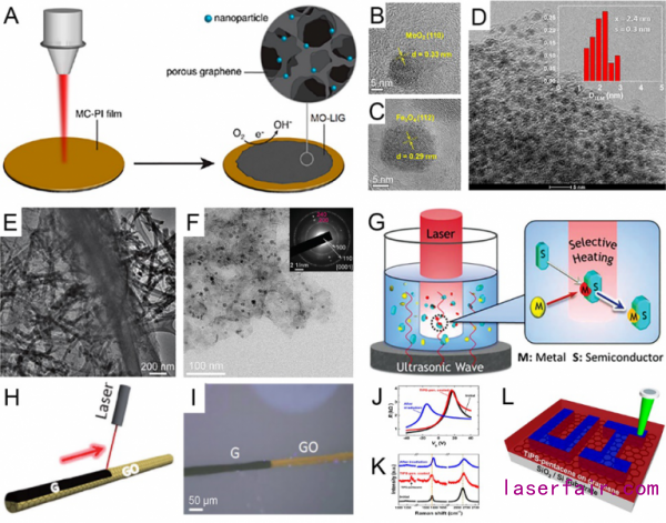(J-L)有機物包覆石墨烯在激光輻照前后的電阻與柵極電壓曲線(J)、拉曼光譜(K)以及在石墨烯納米片上制備任意形狀p-n結的示意圖(L)。