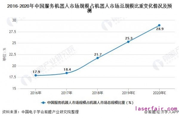 2016-2020年中國服務機器人市場規模占機器人市場總規模比重變化情況及預測