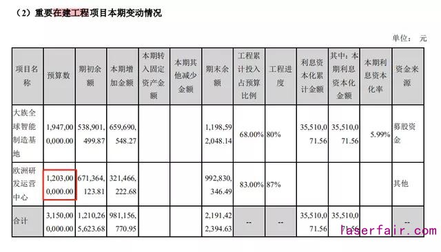 大族激光在公告中并未透露歐洲研發運營中心的實際投入金額,2019年年報中,該項目的預算為12.03億元,較2018年又增加超過1.5億元。