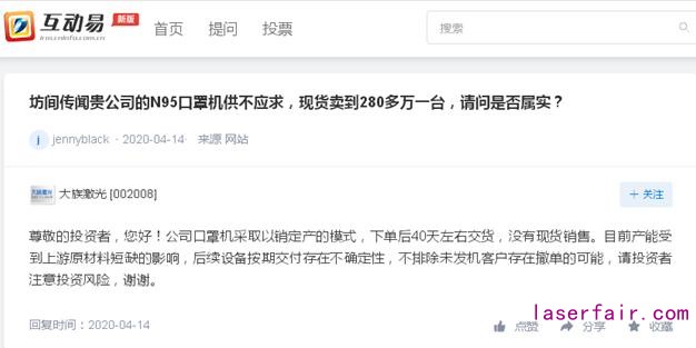 對此價格,大族激光在回復上并沒否認上述價格,而直接回復“公司口罩機采取以銷定產的模式,下單后40天左右交貨,沒有現貨銷售。