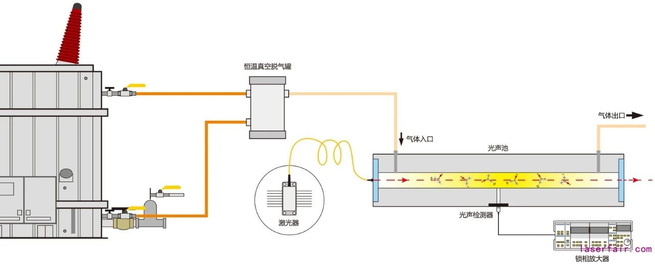 激光光聲光譜技術采用單色激光光源替代傳統紅外寬譜光源和濾光片,避免故障氣體檢測時交叉干擾,電調制代替了機械調制盤,避免了機械結構磨損,同時激光光聲光譜油中氣體在線檢測系統采用恒溫真空脫氣技術,對脫氣機構抽真空,脫氣效率高,重復性好,脫氣過程中變壓器油不與空氣接觸,油樣零污染、零損耗,進而保證變壓器的安全與油氣檢測的重復性、準確度。