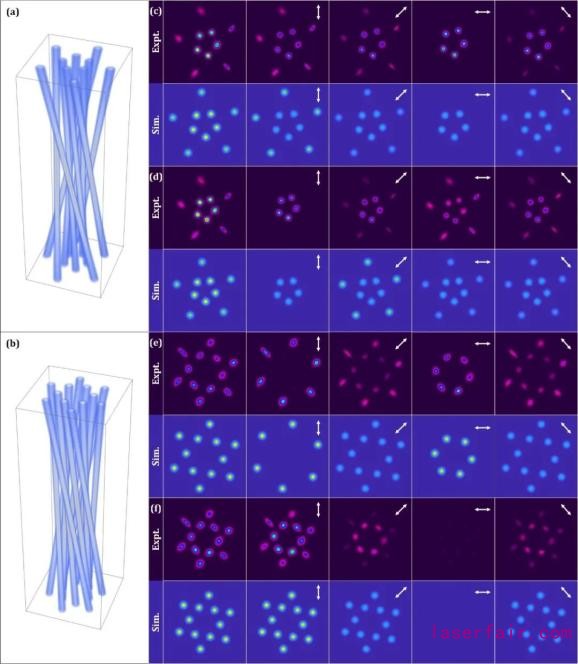 進一步,為了產(chǎn)生矢量結構,實驗上巧妙地采用在軸截面具有各向異性的c-cut晶體作為增益介質(zhì),由于光腔內(nèi)不同橫向尺度控制下的光跡軌道以不同的傾角通過增益晶體,因而對混合波跡模式的各個軌道上的光形成了不同程度的偏振調(diào)制。為了產(chǎn)生渦旋結構,采用了傳統(tǒng)柱透鏡像散模式轉(zhuǎn)換器,由于SU(2)相干態(tài)模式可以看作本征模的疊加波包,因而可類似傳統(tǒng)HG到LG模式轉(zhuǎn)換的過程引入OAM,這個過程中橫向離軸度被轉(zhuǎn)化為OAM,同時波跡二象性使得光束具有雙層雙曲直紋線渦旋結構,橫截面上每層構成正多邊形陣列,兩層合并為標準多角星形狀(如圖2)。綜合兩種調(diào)制方法,標量混合SU(2)平面結構光可以拓展為矢量混合SU(2)渦旋結構光,形成多自由度操控的SAM-OAM耦合態(tài),其中頻率簡并度(Ω)決定橫截面多角星的邊數(shù)(五角星:Ω=1/5;六角星:Ω=1/6;等等);軌道角動量(?)決定光束空間尺寸和扭曲程度,相位?決定多角星圖案的取向角。