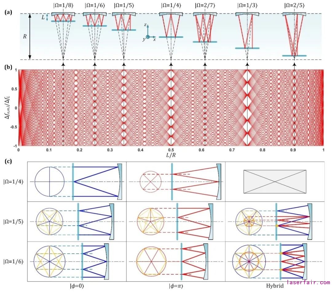 圖1混合SU(2)結構光的產(chǎn)生原理:在平凹諧振腔中精密控制腔長和曲率半徑使其滿足各種橫縱模耦合的頻率簡并態(tài),相應頻率簡并諧振腔可滿足幾何光線軌跡形成各種周期振蕩軌道,還可能產(chǎn)生兩種取向的周期軌道同時產(chǎn)生并滿足諧振條件而形成混合軌道。