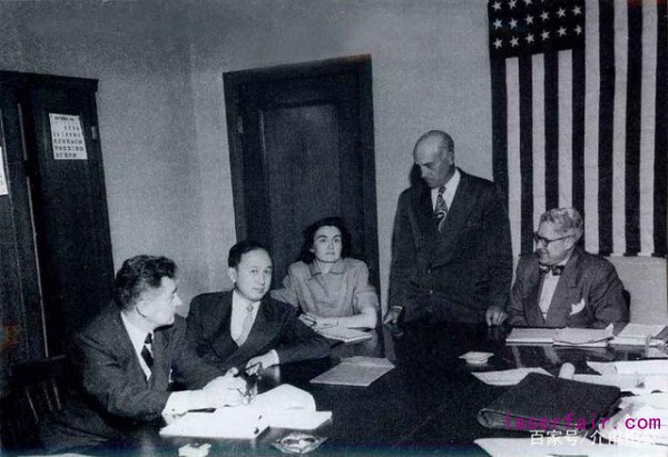 錢學森(左二)因堅持回國而受到美國當局的調查