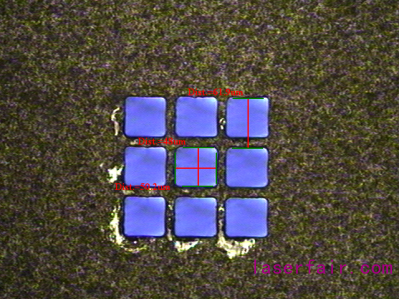 而激光旋切鉆孔技術(shù)則很好的解決了上述問題,既不受材料限制,又可加工高深徑比的無錐度孔。英諾激光利用自主開發(fā)的激光旋切鉆孔技術(shù)對探針卡微孔加工做了大量研究與實(shí)驗(yàn),當(dāng)前可實(shí)現(xiàn)最小孔徑25μm,深徑比≧10:1,最大厚度達(dá)1mm的加工能力,圖7和圖8為英諾激光在Si3N4材料所鉆微孔的顯微照片。除圓孔外,還可加工某些探針卡需求的方孔,最小尺寸可達(dá)35×35μm,R角≦6μm,并且無錐度。圖9為50×50μm的方形孔,R角約6μm。