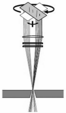 因此,得到高深徑比(≧10:1)、加工質(zhì)量高、零錐甚至倒錐的微孔是具有挑戰(zhàn)的,對于此類需求,最合適的加工方法是采用旋切頭模組,這種旋切頭不但可以使光束繞光軸高速旋轉(zhuǎn),還可改變光束相對材料表面的傾角β,改變?chǔ)轮稻涂蓪?shí)現(xiàn)從正錐到零錐甚至倒錐的變化。當(dāng)前常用的旋切頭模組集中在四光楔掃描頭、道威棱鏡掃描頭和平行平板掃描頭,他們的光學(xué)原理大同小異,通過光學(xué)器件使進(jìn)入聚焦鏡的光束進(jìn)行適當(dāng)?shù)钠揭坪蛢A斜,依靠高速電機(jī)的旋轉(zhuǎn)使光束繞光軸旋轉(zhuǎn),如圖2所示。