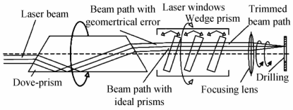 圖4為道威棱鏡掃描系統(tǒng)光路圖,道威棱鏡安裝到一個(gè)高速旋轉(zhuǎn)的空心力矩電機(jī)上,棱鏡旋轉(zhuǎn)一次可使激光旋轉(zhuǎn)掃描兩次。準(zhǔn)直后的激光東經(jīng)過前端的角度偏轉(zhuǎn)和橫向平移后進(jìn)入道威棱鏡和調(diào)整光楔,最后通過聚焦鏡聚焦到工作平面,實(shí)現(xiàn)環(huán)切掃描鉆孔。三個(gè)光楔通過偏擺和旋轉(zhuǎn)補(bǔ)償?shù)劳忡R的加工、裝配誤差,這種裝置可實(shí)現(xiàn)光斑2倍于轉(zhuǎn)速的自轉(zhuǎn),避免了光斑質(zhì)量對孔質(zhì)量的影響,但對道威棱鏡的加工準(zhǔn)確度和裝配準(zhǔn)確度要求很高,后續(xù)的三光楔補(bǔ)償調(diào)整結(jié)構(gòu)也相對復(fù)雜,對于批量生產(chǎn)的工程應(yīng)用具有一定的局限性。