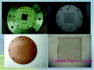 圖6為垂直式探針卡導(dǎo)向板的上蓋(UD)和下蓋(LD)。探針導(dǎo)向板微孔參數(shù)分別由芯片設(shè)計(jì)的測試點(diǎn)設(shè)置、所用的探針直徑而定,一般而言,加工孔徑20-200μm,孔間距40-200μm,厚度0.1-1mm,孔型孔壁要求垂直,位置精度高。導(dǎo)向板材質(zhì)多為陶瓷和氮化硅(Si3N4),氮化硅被越來越多的應(yīng)用于新一代探針卡,但氮化硅極高的硬度使得它無法像傳統(tǒng)可加工陶瓷一樣采用機(jī)械加工,而常規(guī)的激光打孔方式也無法滿足要求。