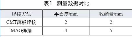 5)焊接變形較小。輕量化軌道交通車輛2mm外蒙皮,分別進行CMT薄板焊接與MAG焊接的對接焊對比。一般薄板焊接后,會在焊縫長度方向產生收縮變形,寬度方向產生角變形,通過測量外蒙皮試板的收縮量和變形量,判斷CMT薄板焊接的優異性。在焊后通過對外蒙皮試件的收縮量和變形量進行測量,得知CMT焊接產生的變形量和收縮量均小于MAG焊接,見表1。