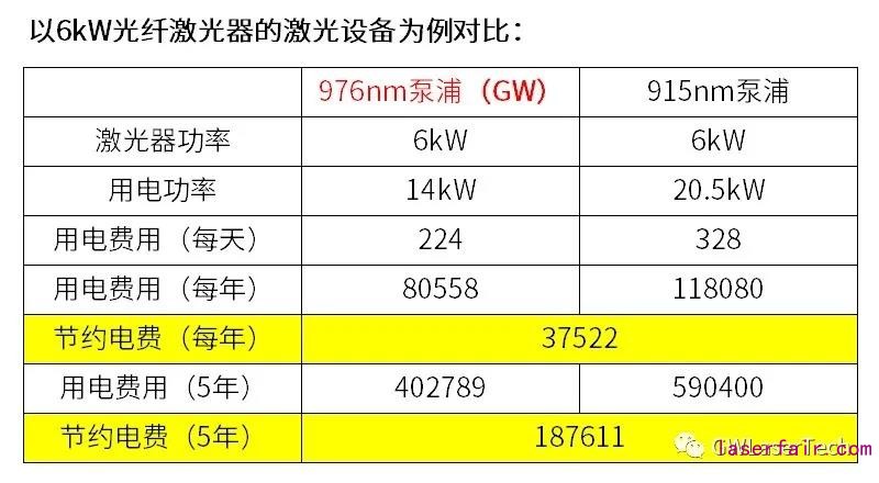 從客戶使用角度分析,當用戶配置使用3kW以上高功率光纖激光器時,若采用更高電光轉化效率的產品,以裝備3kW光纖激光器的激光設備為例,采用更高效率的976nm泵浦技術,光纖激光器的用電費用年將節省約2萬元,整個壽命周期內將節約用電費用約10萬元。