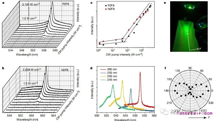 圖3.P2F8和N2F8鈣鈦礦膜的連續激光發射特性。(a,b)在不同功率的連續波激發下發射光譜的演變;(c)激光強度隨C W泵強度的變化而變化;(d)激光峰值波長與光柵周期的關系;(e)CW激光遠場圖案的照片;(f)CW激光的偏振特性。