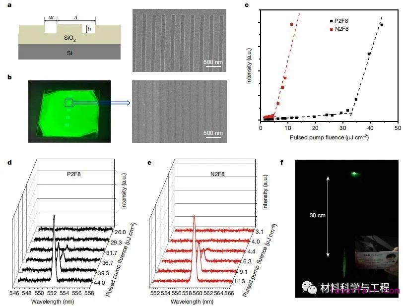 圖2.P2F8和N2F8鈣鈦礦膜的DFB腔和脈沖激光特性。(a)空氣溝槽寬度w =120 nm,光柵周期Λ=250 nm和光柵高度h=60 nm 的DFB腔的圖案設計(左)和頂SEM圖像(右);(b)在紫外線燈和在DFB襯底上旋涂的P2F8膜的SEM圖像,鈣鈦礦層的厚度為90nm;(c)激光強度作為脈沖能量的函數;(d,e)在P2F8(d)和N2F8(e)閾值附近,脈沖激發下發射光譜的演化;(f)P2F8薄膜激光光束的遠場模式。