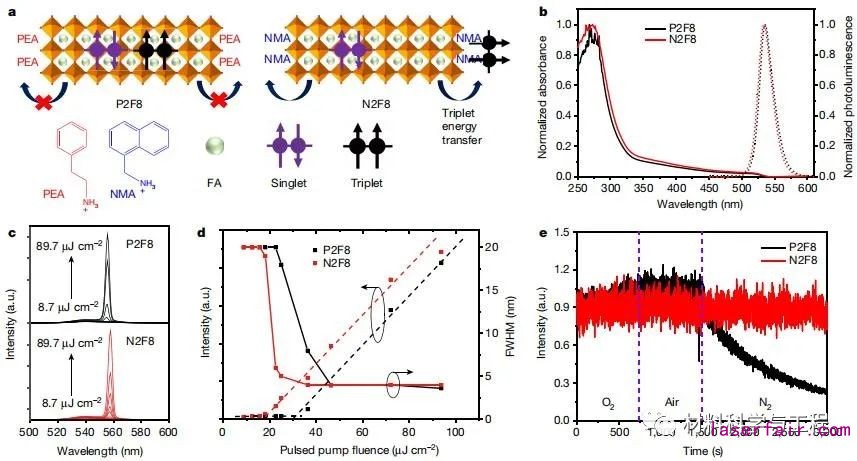 為了表明由三重態激子引起的STA對準-2D鈣鈦礦中的反轉是有害的,作者研究了基于FAPbBr3的準2D鈣鈦礦,其具有兩種不同的有機陽離子,即苯乙基溴化胺(PEABr)和1-萘甲基溴化銨(NMABr)。基于PEABr的鈣鈦礦(P2F8)摻入具有高三重態能量的有機陽離子,而基于NMABr的鈣鈦礦(N2F8)包含具有低三重態能量的有機陽離子。P2F8和N2F8具有類似的分子大小,導致準二維鈣鈦礦具有相當的結晶度和光物理特性。