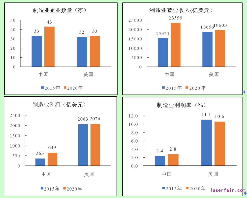 在利潤總額方面,我國制造業上榜企業利潤總額增加282億美元,年均增長15.76%;而同期美國企業利潤總額增長13億美元,年均增速僅為0.13%。在利潤率變化方面,美國制造業上榜企業利潤率由2015年的11.1%降至2020年的10.6%;而同期我國上榜企業利潤率由2.4%上升到2.8%。