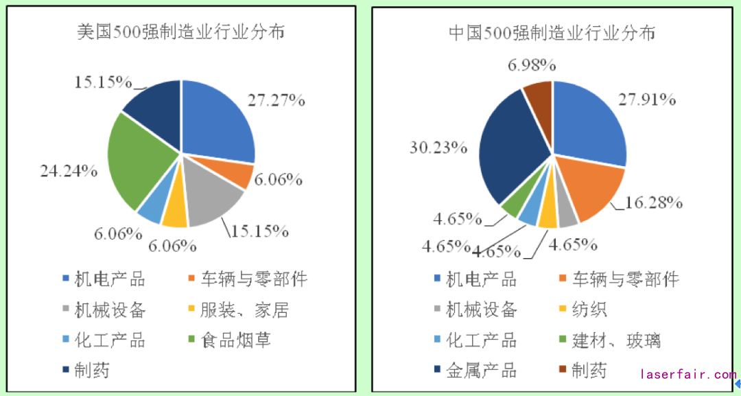 從產業結構看,美國上榜制造業多集中在機電產品、機械設備、制藥以及食品煙草等行業;我國則主要集中在金屬產品、機電產品、車輛與零部件等行業。