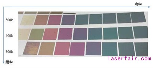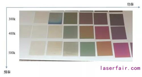 功率是能夠影響激光單脈沖輸出最主要最直觀的控制變量,經過測試后發現,在不銹鋼打彩時,頻率在和脈寬進行“較量”,頻率這一參數對色彩變化的影響更為豐富些。