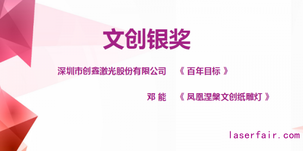而深圳創鑫激光股份有限公司的作品《百年目標》、鄧能的個人作品《鳳凰涅槃文創紙雕燈》榮獲本次激光文創大賽銀獎。