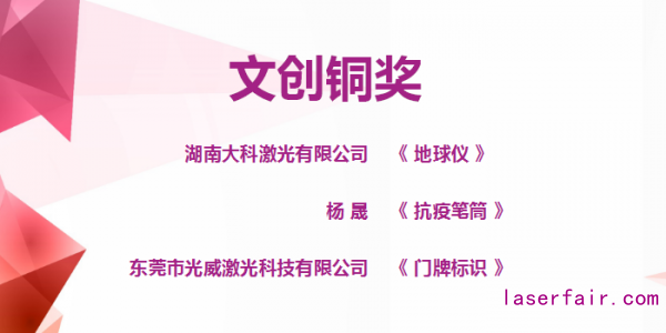 湖南大科激光有限公司的作品《地球儀》、楊晟的個人作品《抗疫筆筒》、東莞市光威激光科技有限公司的作品《門牌標識》等三份作品榮獲本次激光文創大賽銅獎。