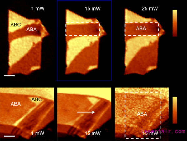 光學顯微鏡無法區分TLG中的ABA和ABC堆垛,本研究利用拉曼光譜2D特征峰的差異來判斷其堆垛結構,并通過共聚焦拉曼光譜顯微鏡對TLG進行了亞微米尺度的掃描成像(圖2),其中ABA堆垛(暗)和ABC堆垛(明)之間的界面即為疇壁(domain wall)。除了拉曼光譜,光學二次諧波(SHG)也被用于表征TLG的ABA和ABC堆垛,因為前者是中心反演對稱破缺的,有SHG特征,而后者是中心反演對稱的,沒有SHG響應。論文中利用激光對TLG進行了面掃描輻照,每次輻照完成后都進行一次拉曼成像。實驗結果表明,ABA-ABC疇壁在激光的驅動下產生了明顯的移動。隨后,細致的拉曼光譜和SHG譜學測量也證明了TLG中從ABC堆垛到ABA堆垛的結構相變(圖3)。