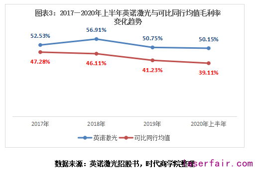 招股書顯示,2017年、2018年、2019年和2020年1—6月,英諾激光的綜合毛利率分別為52.53%、56.91%、50.75%和50.15%,可比同行的毛利率均值分別為47.28%、46.11%、41.23%和39.11%。