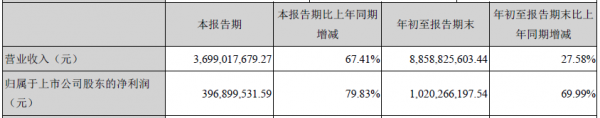 10月25日晚,大族激光科技產(chǎn)業(yè)集團(tuán)股份有限公司(以下簡稱“大族激光”或“公司”)發(fā)布了2020年第三季度報(bào)告。報(bào)告顯示,大族激光第三季度營收36.99億元,同比增長67.41% ;歸屬于上市公司股東的凈利潤3.97億元,同比增長79.83%。
