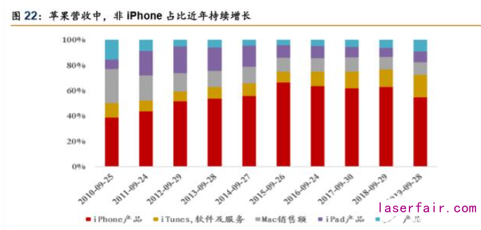 看好未來非 iPhone 訂單占比提升,應用場景進一步打開。以 iPad、Apple Watch、 AirPods 為代表的手機以外的消費電子產品近年來銷量持續釋放,配套產線中對激光加工設 備的需求拓寬了激光設備應用場景。例如 Apple Watch 生產工藝中,就采用激光工藝進行去 毛刺處理,此外部分版本產品表冠的鋸齒狀紋路也采用激光進行沖刻;AirPods 無線充電盒 提供激光鐫刻服務。公司目前來自蘋果的收入可大致拆分為 iPhone+非 iPhone,其中 iPhone 相關收入仍占主要。隨著蘋果非 iPhone 產品在營收占比的逐步擴大(2019 財年,蘋果非 iPhone 營收占比達 66%,同比+8pp),我們認為蘋果未來將持續發力非 iPhone 產品線,加 大相關產品的研發力度與資源傾斜,公司產品有望受益于此打開下游市場豐富度,進一步增 厚板塊業績。