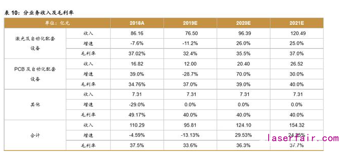 假設 1:激光設備板塊,2019 年受下游需求趨穩影響短暫回調;展望 2020 年,小功率 板塊有望受益下游客戶創新力度提升再獲高增長;大功率板塊有望受益核心激光器光源自產 提升盈利能力,此外下游焊接市場在激光設備經濟性持續顯現及制造業升級背景下有望開啟 高速增長期。我們假設公司2019/2020/2021板塊營收同比增速分別為-11.2%/26.0%/25.0%; 毛利率方面,受益產品結構改善疊加激光器光源持續推進自產,假設公司 2019/2020/2021 板塊毛利率分別為 32.4%/35.5%/37.0%。