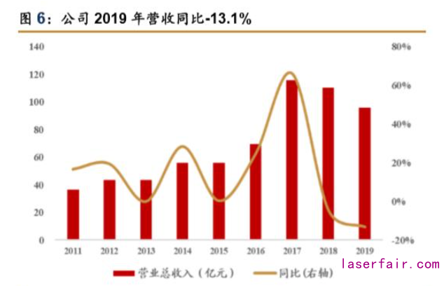 國內激光設備龍頭,深耕激光產業 20 余載。公司成立于 1996 年,初期產品為激光打 標機。經過 20 余年的內生外延,公司目前業務線包括激光打標機、激光切割機、激光焊接 機、PCB 專用設備等高端裝備產品;豐富的產品群為公司開拓了龐大的客戶群體,公司下游 客戶包括蘋果、寶馬、奔馳、京東方、深南電路等各行業標桿企業。根據《2019 中國激光 產業發展報告》,公司系 2018 年國內唯一一家營收規模突破百億的激光設備公司。