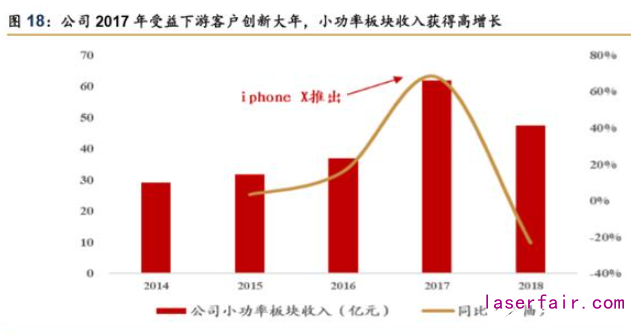 2017 年受益 A 客戶創新大年,公司小功率板塊取得大幅增長。公司自 2008 年獲得蘋 果認證切入其產業鏈,2012 年成功打入蘋果核心供應商名單;2017 年受益客戶新品重大創 新帶動的產線設備需求斬獲大量訂單,業績取得高速增長;而 2018-2019 年蘋果創新力度趨 緩,導致對產線設備更換需求回落,公司小功率板塊所有承壓。