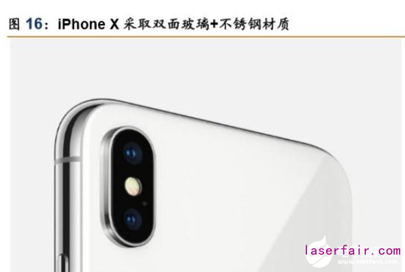 2017 年,蘋果推出新款機型 iphone X,作為 iphone 系列十周年產品,新款機型采取了 諸多重大創新,例如屏幕首次采用 OLED 材質、取消沿用 10 年的底部 Home 鍵、后置雙攝 改為了豎向排列以及重啟雙面玻璃+不銹鋼材質中框設計等。機身的重大革新催生了生產線 采用新的設備及工藝需求,其中對于新增激光加工設備需求包括: