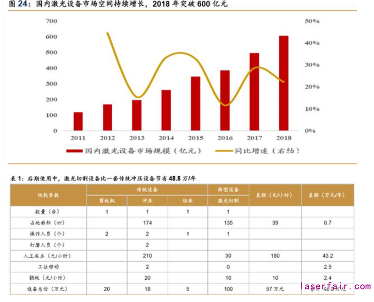 國內激光設備市場持續增長,2018 年市場規模突破 600 億元。根據《2019 中國激光產 業發展報告》,2018 年國內激光設備市場規模達 605 億元,同比+22%。按下游來看,工業 加工為最大應用市場,占比 63%(2017 年數據);其次為信息市場,占比 21%(2017 年數 據)。隨著未來激光器價格的降低帶動激光設備經濟性持續改善,以及制造業對自動化產線 建設、替代人工的需求持續上漲,預計將推動激光設備對傳統工藝(機床等)進一步替代, 以及在新型應用市場滲透率的加速提升,我們認為激光設備市場仍將保持增長態勢。