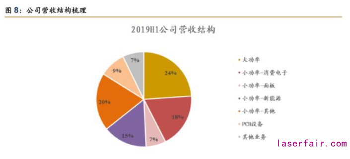 由于公司 2019 年業績快報中未披露各業務板塊具體收入,我們以 2019 半年報數據為 例對公司營收結構進行拆分。2019H1 公司實現營收 47.3 億元(同比-7.3%),其中激光設備 板塊營收 39.7 億元(同比-2.7%),PCB 設備板塊營收 4.2 億元(同比-37.6%),其他業務 營收 3.4 億元(同比-2.3%)。激光設備板塊中,大功率板塊營收 11.3 億元(同比-5.4%); 小功率營收 28.4 億元,其中小功率板塊可繼續細分為:1)消費電子營收 8.8 億元(同比 -17.7%);2)面板營收 3.2 億元(同比+7.5%);3)新能源營收 7.1 億元(同比+125.2%); 4)小功率其他業務營收 9.3 億元。