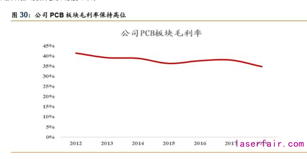 板塊毛利率承壓,但仍維持高位,預計 2020 年受益產品結構改善毛利率回升。公司 PCB 板塊主營產品包括機械鉆孔機、激光鉆孔機、LDI(激光直接曝光機)等。受益激光鉆孔機、 LDI 等設備高毛利,板塊整體毛利率維持高位。2018 年板塊毛利率為 34.8%,同比-3.2pp。 我們預計,隨著 5G 時代對 PCB 加工精密度要求的提升將增厚激光鉆孔設備、LDI 等高端設 備需求,公司 PCB 板塊產品結構的改善預計將推動板塊毛利率的穩步回升。