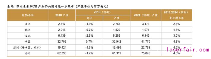 受益本土人力成本優勢以及龐大的消費電子市場驅動電子產業鏈的日臻完備,大陸近年 持續承接歐美及臺灣的 PCB 產能。根據機構 Prismark 的統計結果,2018 年全球 PCB 產值 約為 624 億美元,同比增長約 8%;其中 2018 年中國大陸 PCB 產值約為 327 億美元,同比 增長約 10%,大陸 PCB 產值占全球 PCB 產值的比重已達 51%,相比 2008 年這一比例已提 升 20pp。如今國內已經形成了以珠三角、長三角地區為核心區域的 PCB 產業聚集帶,中西 部地區近年由于成本優勢,PCB 產能擴張持續提速,未來有望成為下一重要產業集群。根據 Prismark于2019年Q4的預測,2019-2024年中國地區PCB產值復合增長速度將達到4.9%, 高于全球 PCB 產值復合增長率 4.3%,PCB 產業仍將繼續向中國大陸集中。